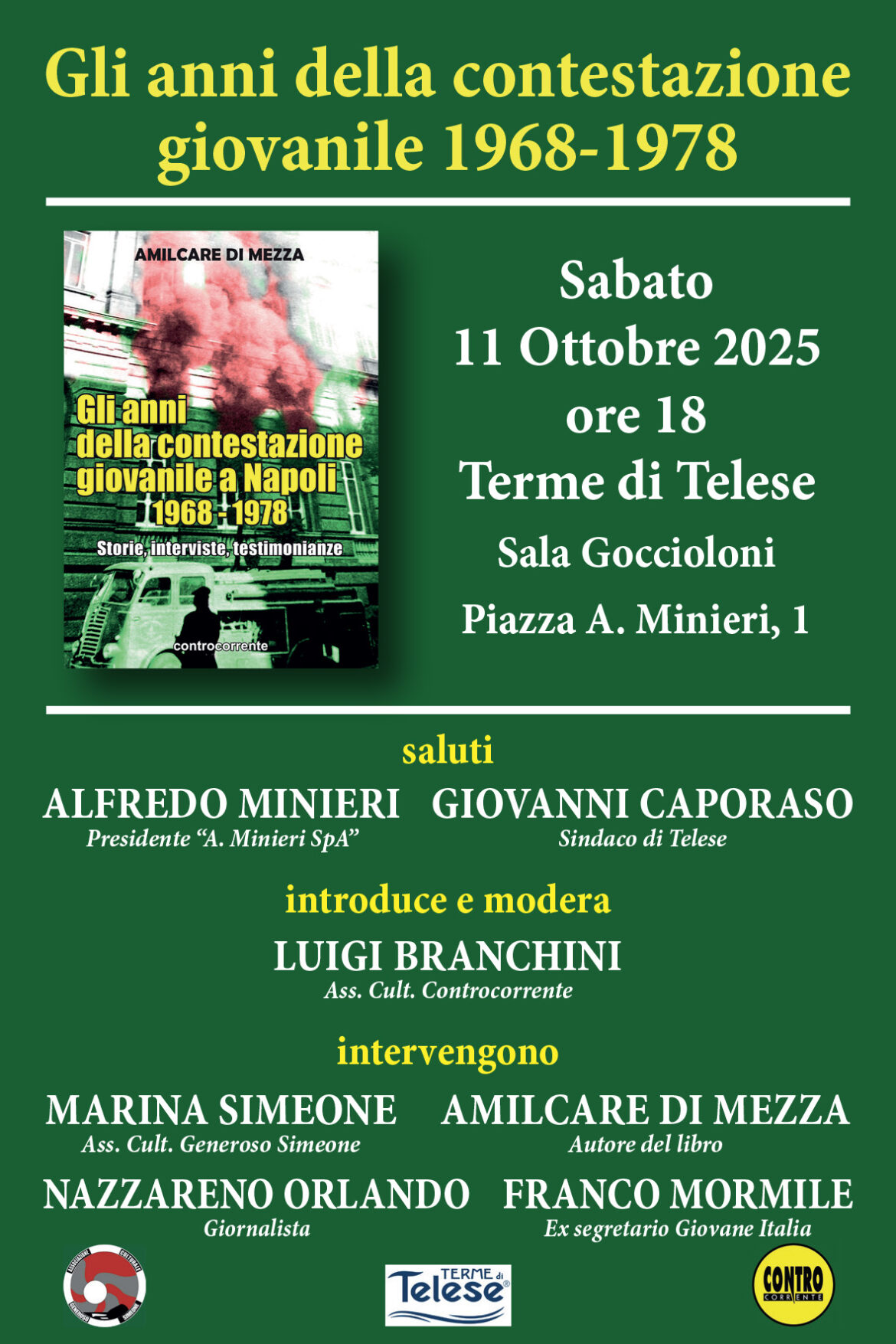 Sabato 11 ottobre, alle ore 18, presso la Sala Goccioloni delle Terme di Telese, ci sarà la presentazione del libro di Amilcare Di Mezza, “Gli anni della contestazione giovanile a Napoli 1968-1978” edito da Controcorrente. Dopo i saluti del sindaco di Telese Giovanni Caporaso e del Presidente della società che gestisce le terme Alfredo Minieri,