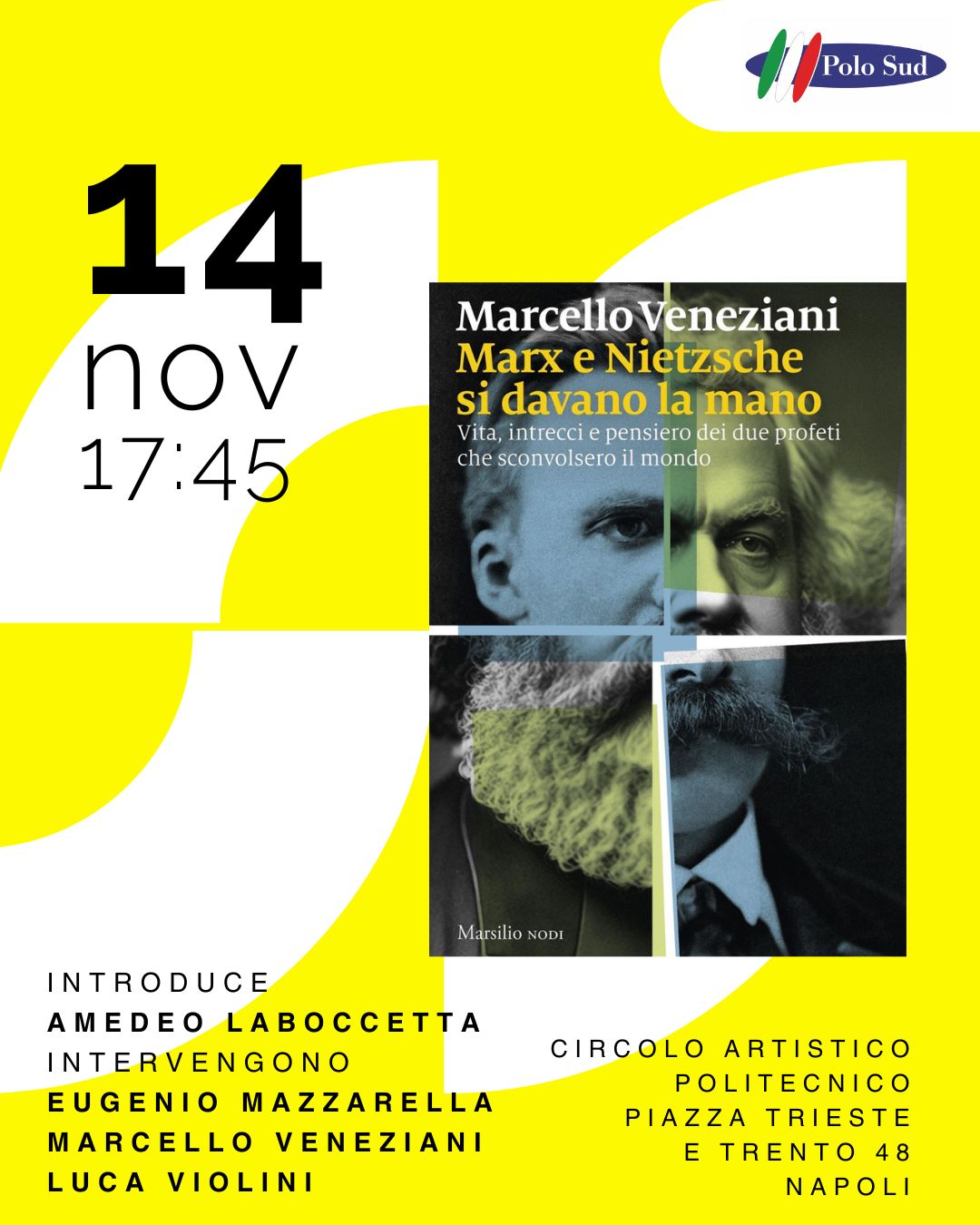 Venerdì 14 novembre 2025, alle ore 17:45, nella sala del Circolo Artistico Politecnico di Napoli (piazza Trieste e Trento, 48) sarà presentato l’ultimo libro di Marcello Veneziani “Marx e Nietzsche si davano la mano”. Dopo l’introduzione di Amedeo Laboccetta, ci saranno gli interventi dell’Autore e di Eugenio Mazzarella, intervallati dalla lettura di brani dal libro